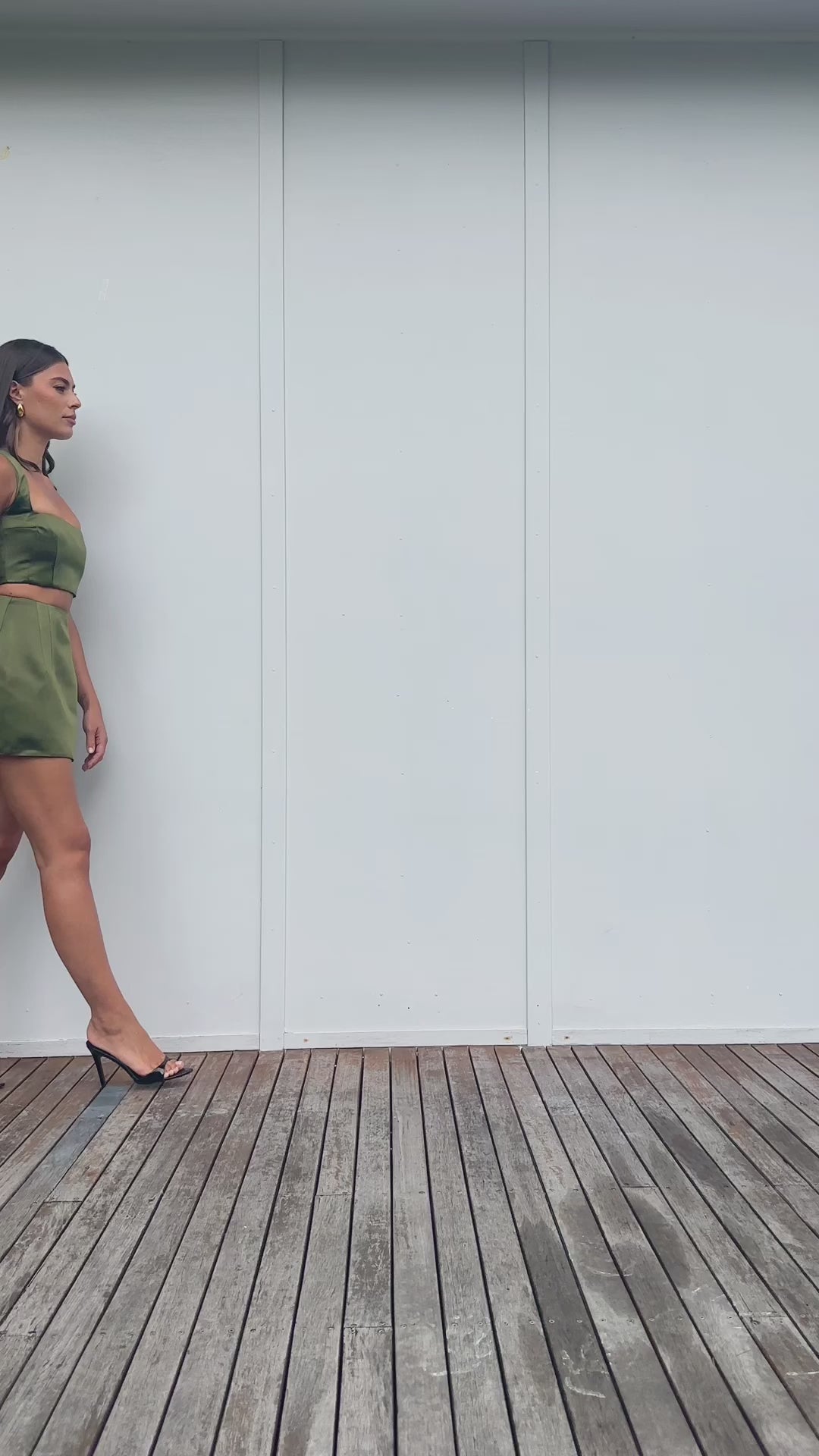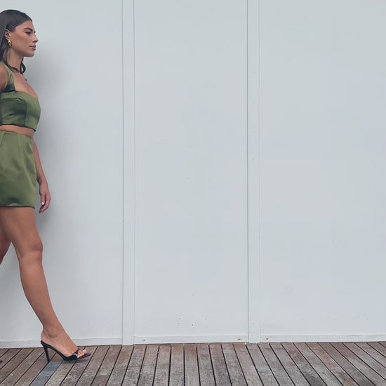 The ultimate skirt to elevate any outfit with this luxurious olive satin that can be paired with the matching Mia top.